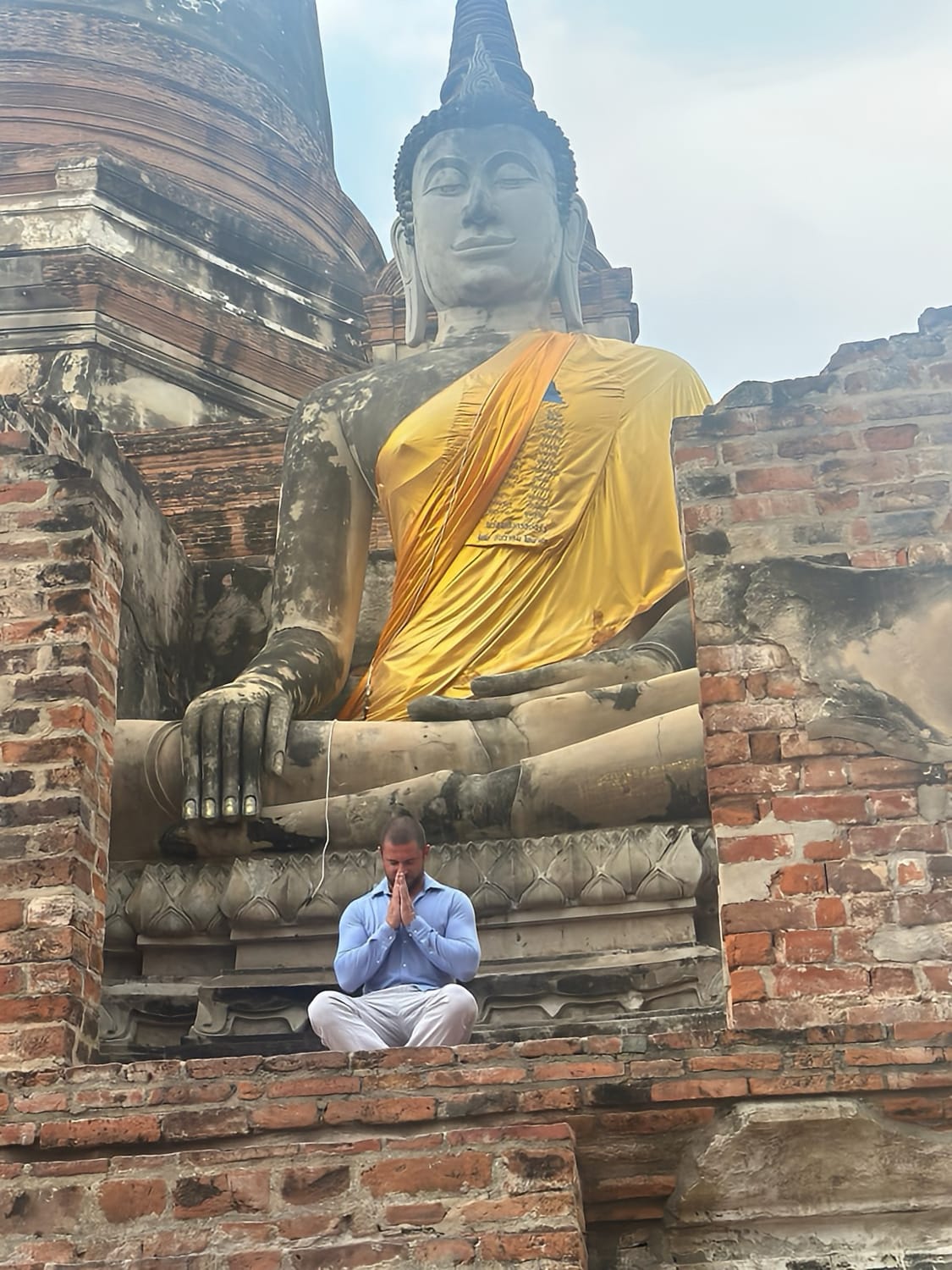 Was ich dort lernte, hat meine Arbeit verändert — nicht weil ich Mönch geblieben bin, sondern weil ich es nicht geblieben bin. Ich habe ein Unternehmen eröffnet, Bücher geschrieben, Menschen begleitet. Mit Mönchen bei der Eröffnung eines Sportstudios. Mit einem Freund vor einer Buddhastatue. Kein Widerspruch — das ist der Punkt.